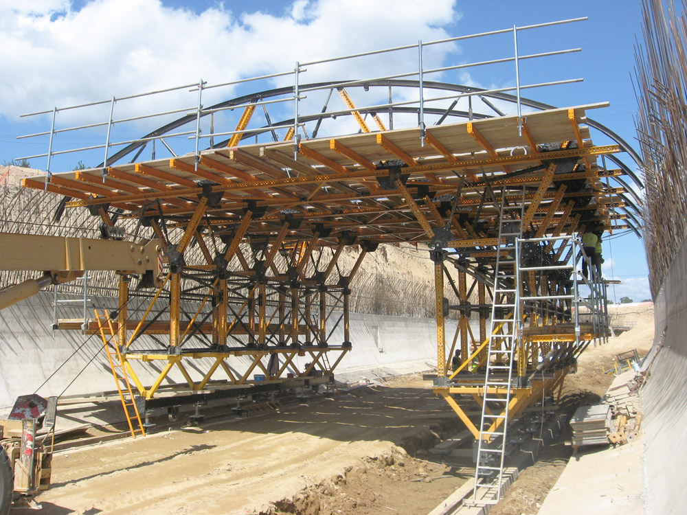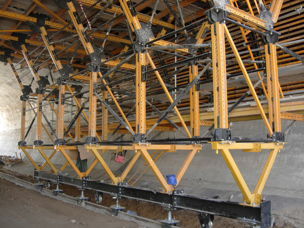 Para realizar la bóveda del falso túnel, el encofrado interior se sitúa sobre un carro porta-encofrado, desplazable por rieles. El carro es una estructura de Riostras MK, con plataformas de trabajo a varios niveles con barandillas de 1,5 m y accesos seguros.