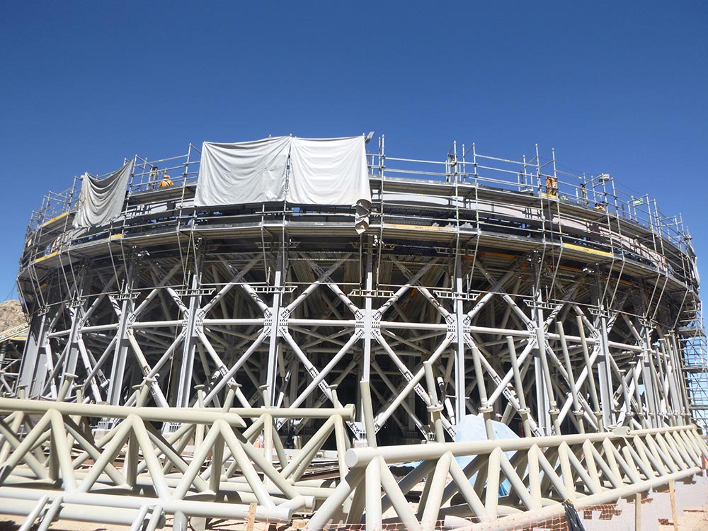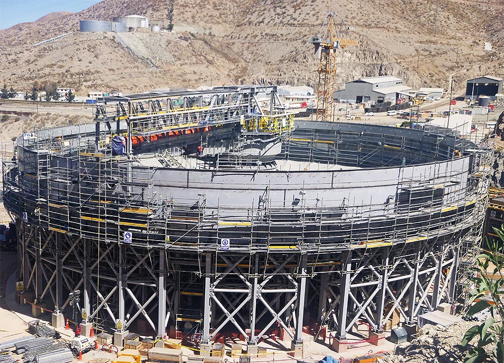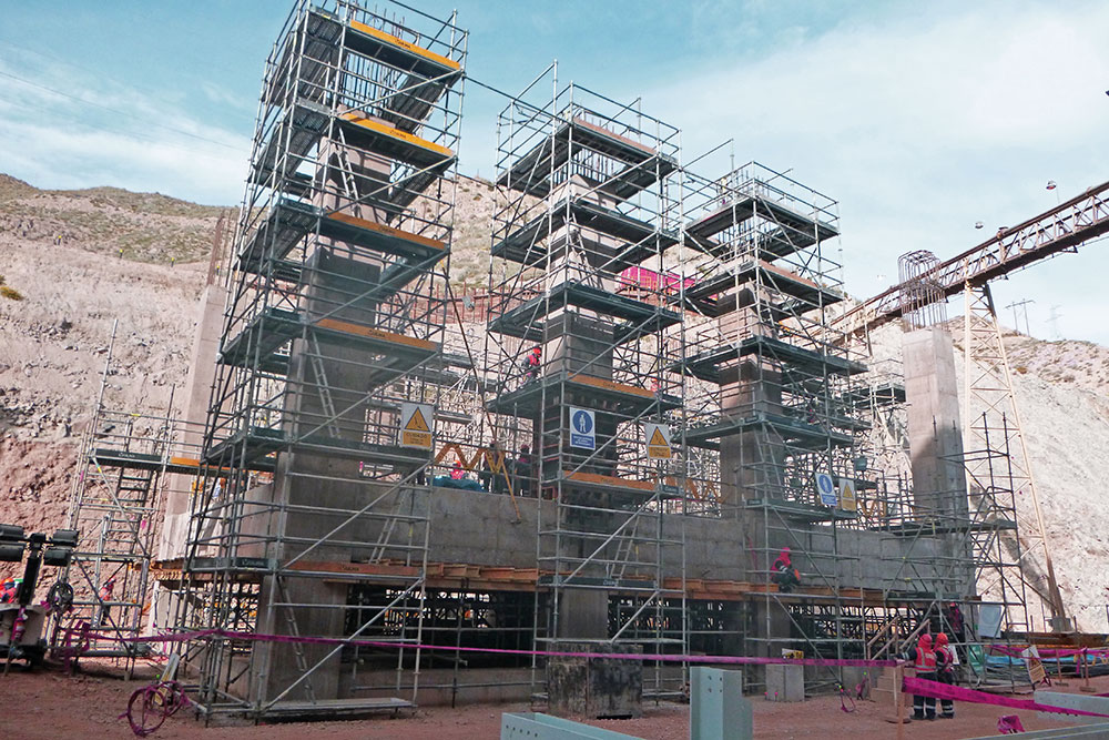 Se utiliza el Encofrado modular ligero NEVI para poder realizar los muros contrafuegos de 12 metros de alto y para encofrar las bases donde irán los espesadores. Se aplica también en las columnas y placas de los edificios HPGR y silos. Para la losa se utiliza el sistema de Cimbra BRIO como apeo.