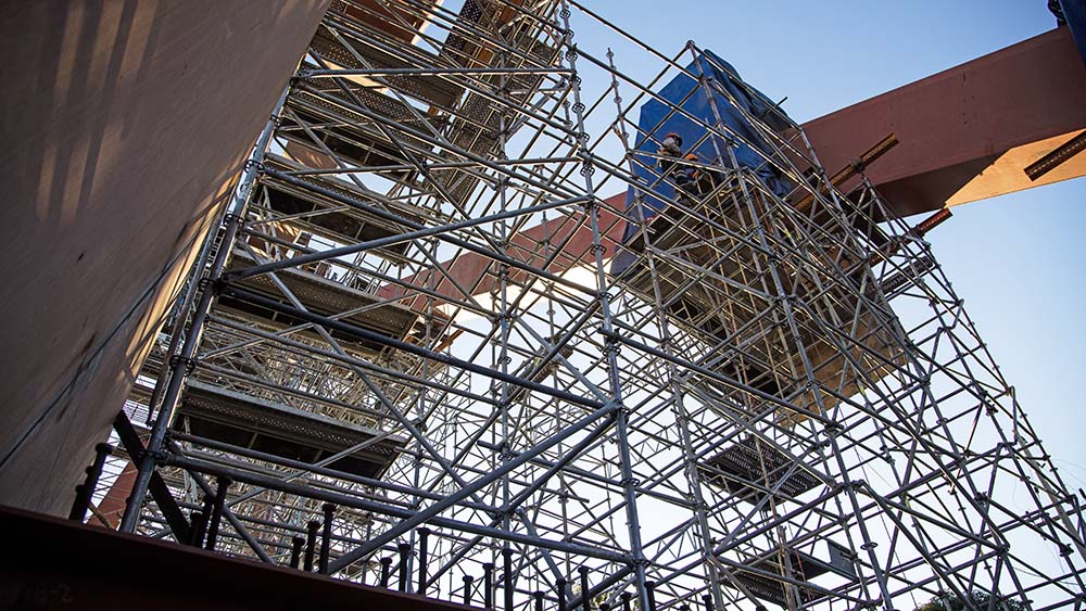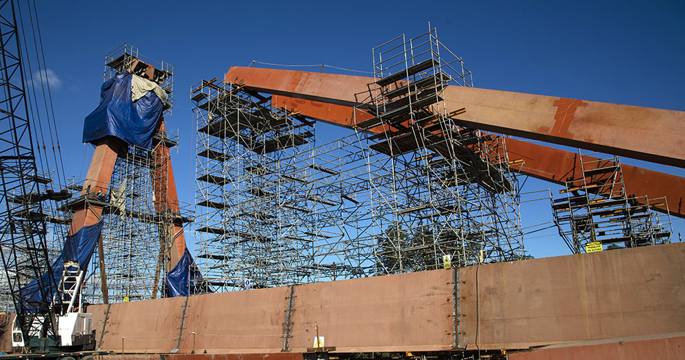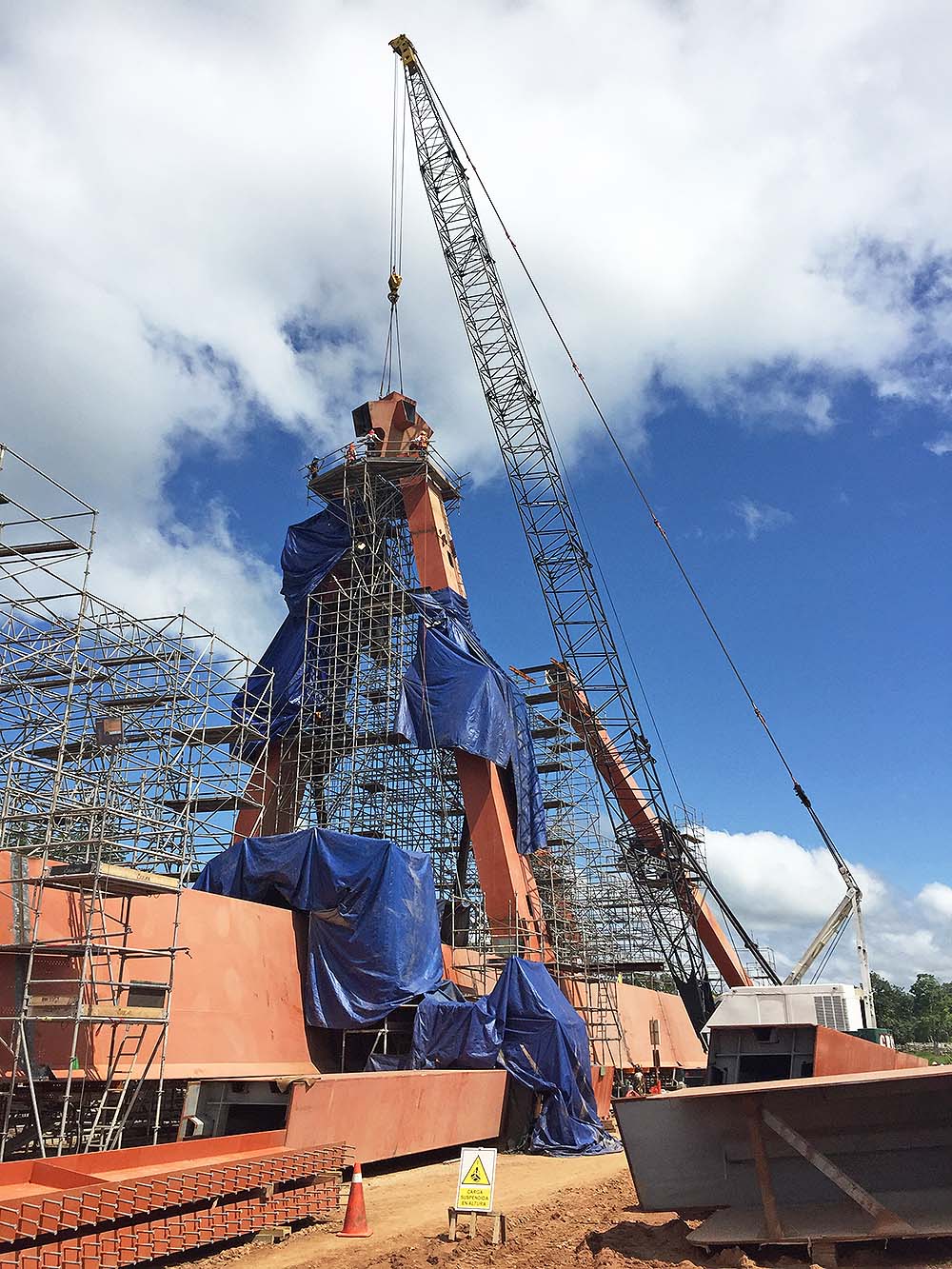Adicionalmente para la unión de los 2 tramos del puente luego del lanzamiento se requirió de un andamio suspendido que rodee a la viga longitudinal y permita los trabajos finales.