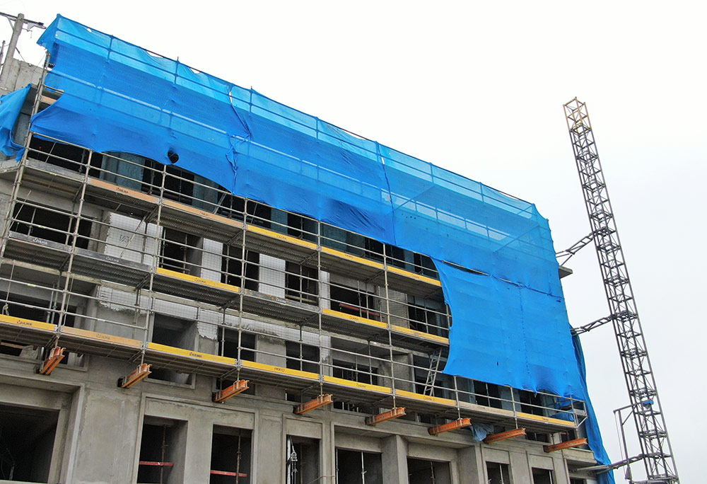 Para realizar los trabajos en fachada se adoptó el uso de andamios en voladizo con el sistema BRIO y vigas metálicas como apoyo denominadas riostras MK-180. Las dimensiones de los andamios empleados son: ancho 1.02 m, largo hasta 24 m y una altura de 8.00 m más 1 m de barandas.
