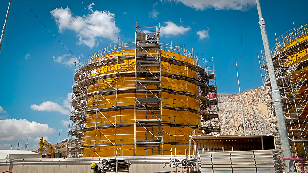 Mediante el andamio de fachada BRIO ULMA ofreció la solución más rentable y segura para dar accesos a todos los niveles donde se requería el empernado del rack metálico. Este andamio además, sirvió como base del andamio para el montaje de los silos. La versatilidad del sistema y los diversos componentes permitió dar acceso a todo el perímetro exterior e interior de los silos y realizar los trabajos cumpliendo con los requisitos de seguridad. Los trabajos para el rack y los cuatro silos tanques tuvieron una duración de 4 meses.