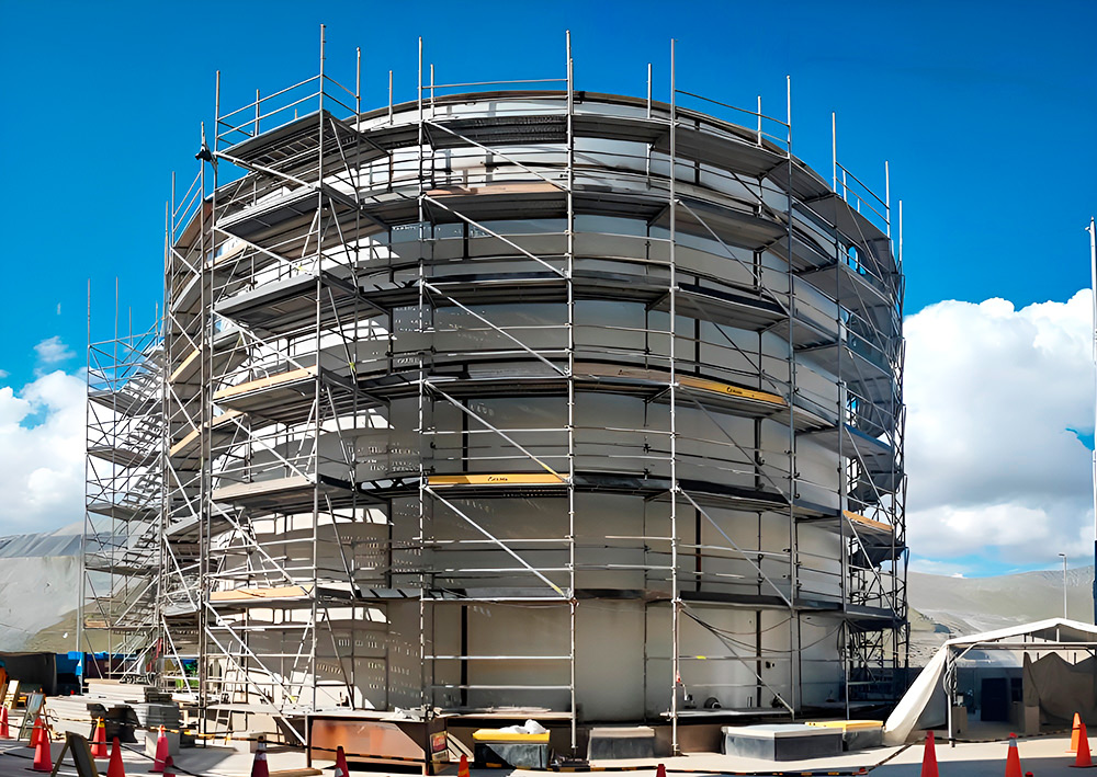 Mediante el andamio multidireccional BRIO se ha creado una zona de trabajo segura en todo el perímetro exterior habilitando plataformas y escaleras de acceso y salida de emergencia. La versatilidad del sistema y los diversos componentes como las vigas de paso permitieron salvar luces importantes y optimizar el número de apoyos en la parte interior con el consecuente ahorro en material y tiempos de montaje. Los trabajos realizados para los tres tanques tuvieron una duración de 5 meses.