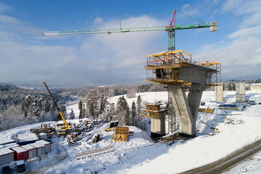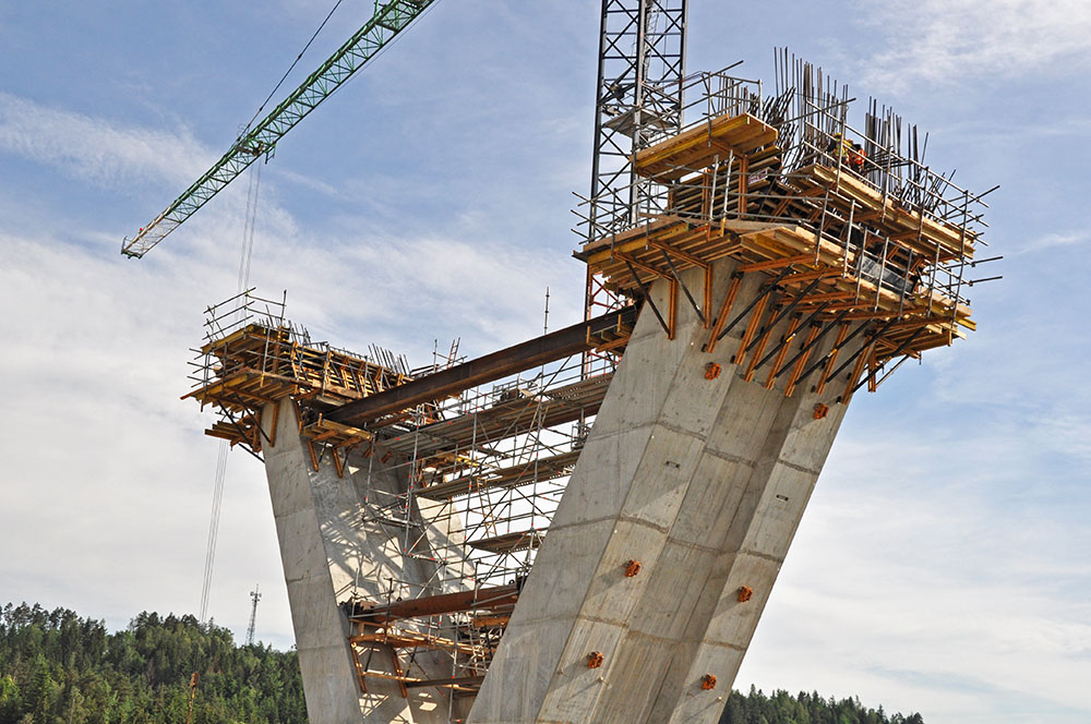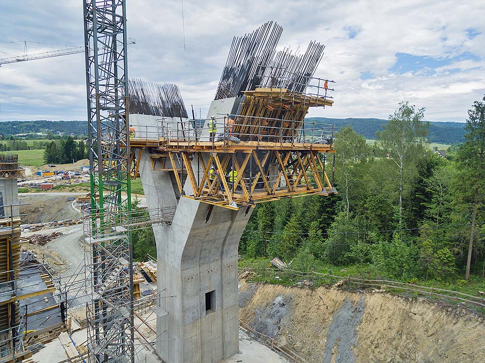 Las columnas en forma de “Y” se han ejecutado en tres fases. Los fustes, de sección rectangular hueca, se han realizado en tongadas de 4,56 m con el sistema de vigas VMK sobre consolas de trepado configurables BMK. En la base del capitel, donde arrancan los brazos de la Y, se ha empleado, además de consolas BMK, el encofrado a una cara UCAB-EUC. Este conjunto ha permitido generar una superficie de apoyo para el encofrado de muro de 6,40 m de altura. El último tramo de estructuras inclinadas se ha realizado con el sistema autotrepante ATR y la consola BMK capaz de adaptarse al ángulo de inclinación predeterminado. La estructura del sistema autotrepante se ha conformado con cerchas MK y un único juego de cilindros hidráulicos ubicados en la cara exterior de los brazos del fuste.